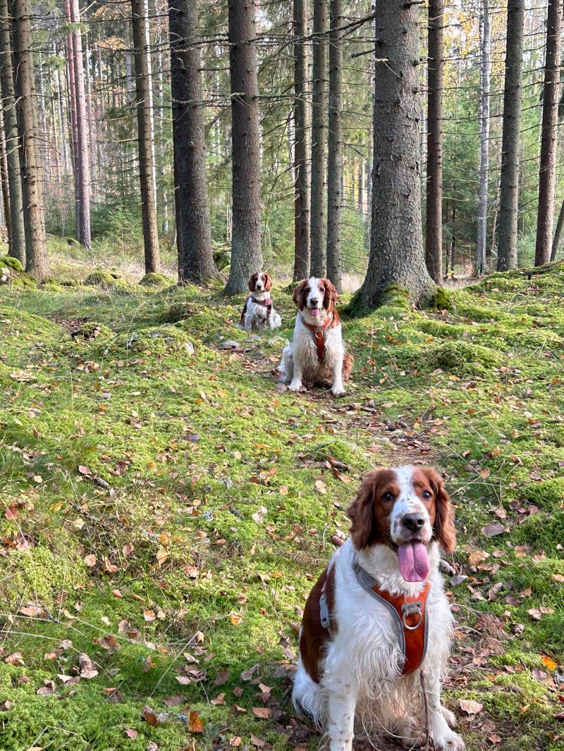 Lokakuu alkaa kääntyä loppua kohden, mutta vielä on saatu nauttia ihanasta aurinkoisesta, värikkäästä ja suht lämpimästäkin syksystä. Ihan vielä ei ole pimeä jo heti töistä kotiin tullessa ja päästään koko konkkaronkka metsään päästelemään työpäivän höyryjä pois. Nadakin on jo tovin halunnut mukaan ulkoilemaan, ja kiva tämän kolmikon kanssa onkin retkeillä. Välillä vievät metsän hajut spanielia mennessään, mutta pikku odotteleun jälkeen kyllä tullaan korvat hulmuten namitaskun äärelle. Nautitaan siis kun vielä voidaan, kohta iskee pimeys, märkyys ym. ikävyydet ja mielen valtaavat ajatukset että helmikuuhun ja valostuviin päiviin on ihan liian pitkä aika.